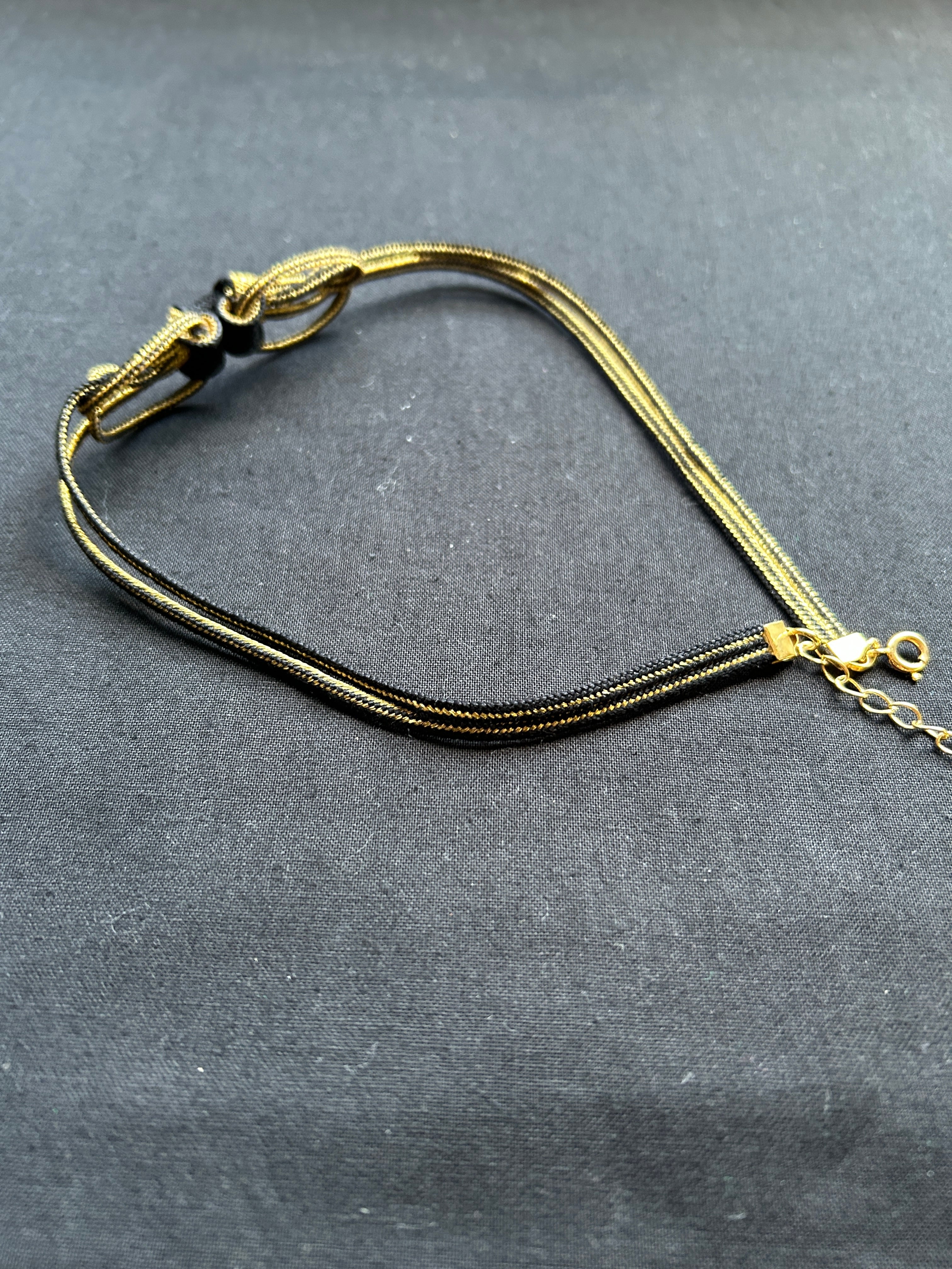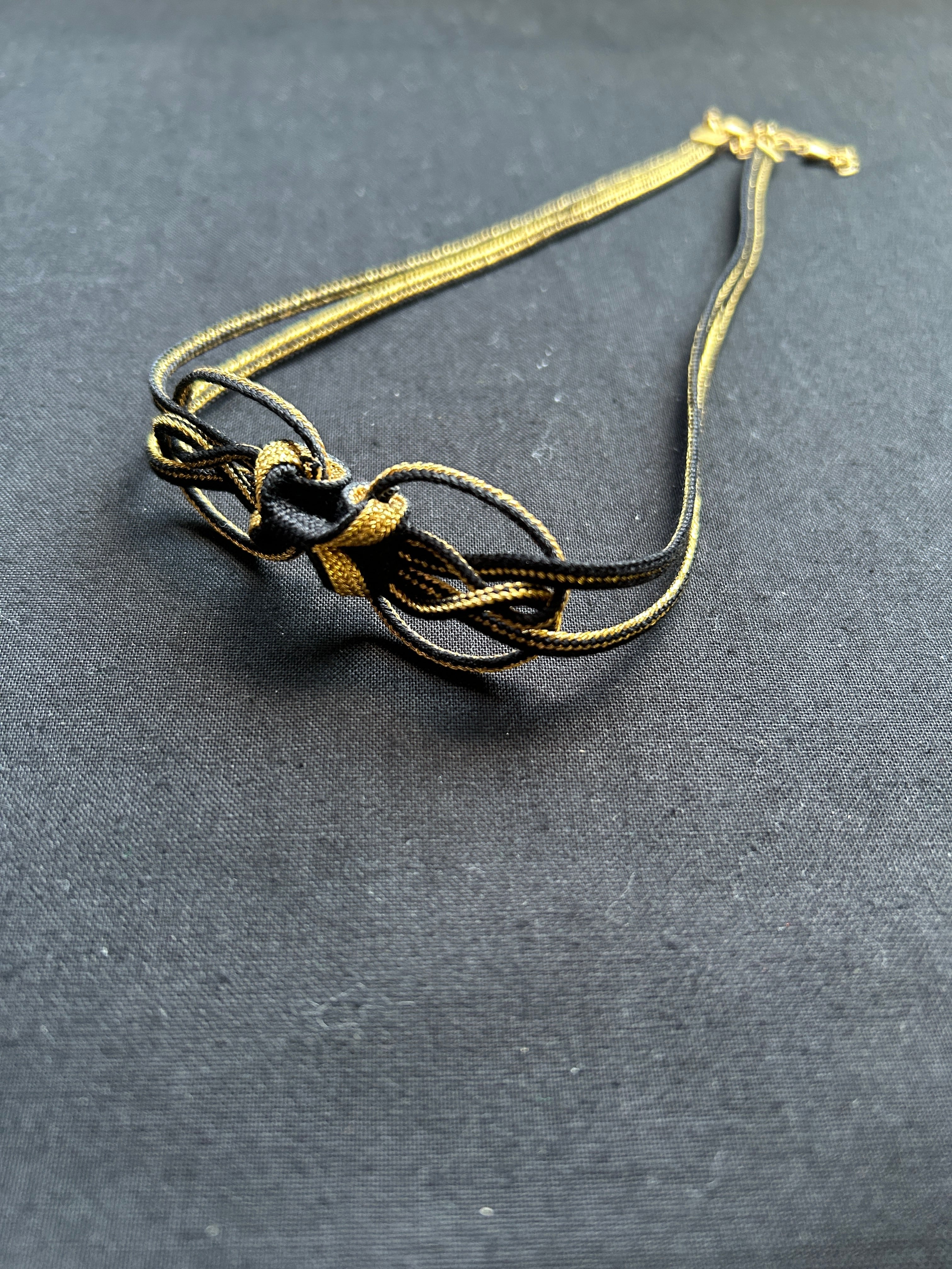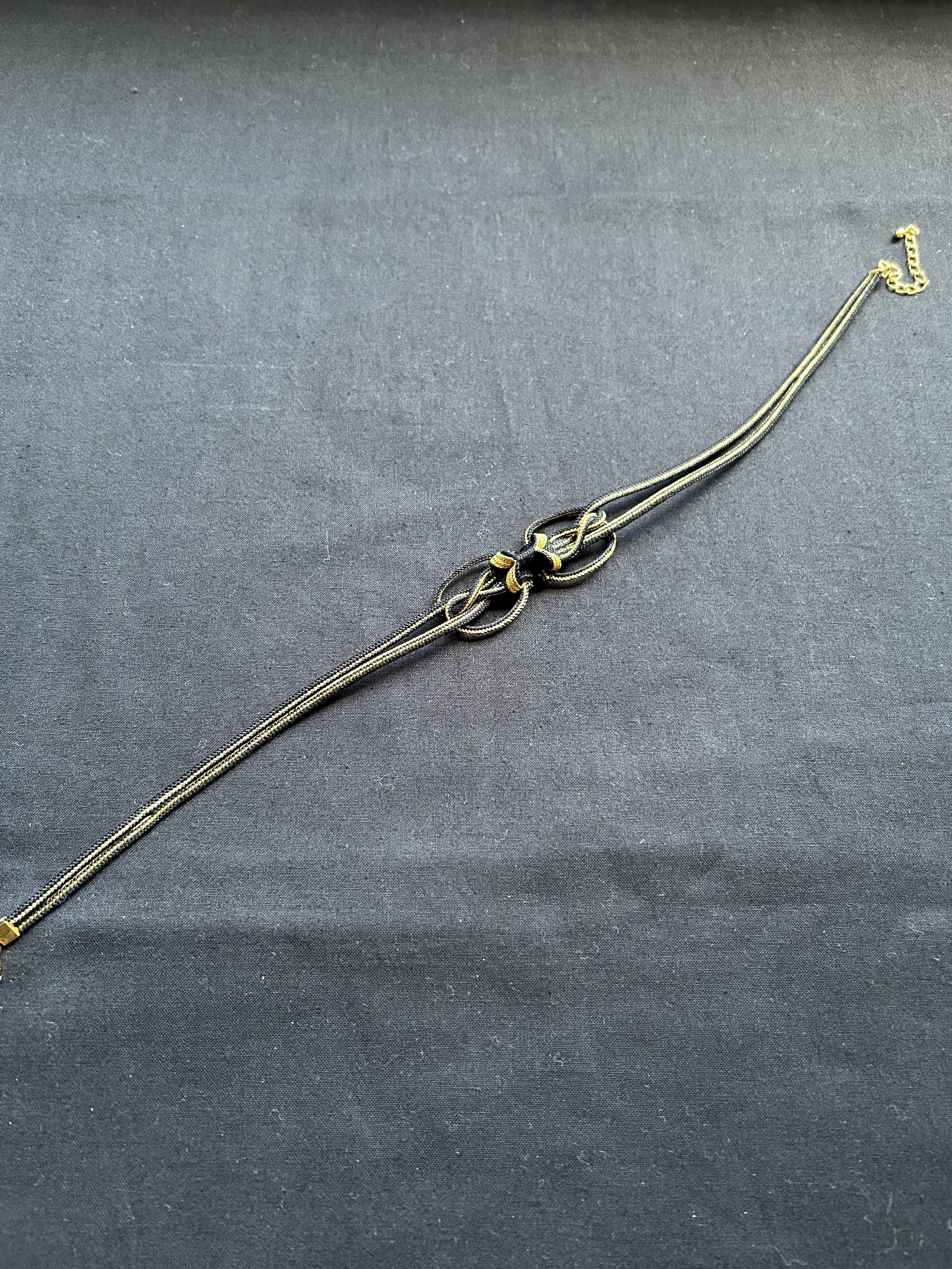 ふたつの輪が重なり合う「双環(そうかん)」を、昭和の組紐職人が生み出した希少な紐でかたどったチョーカーです。