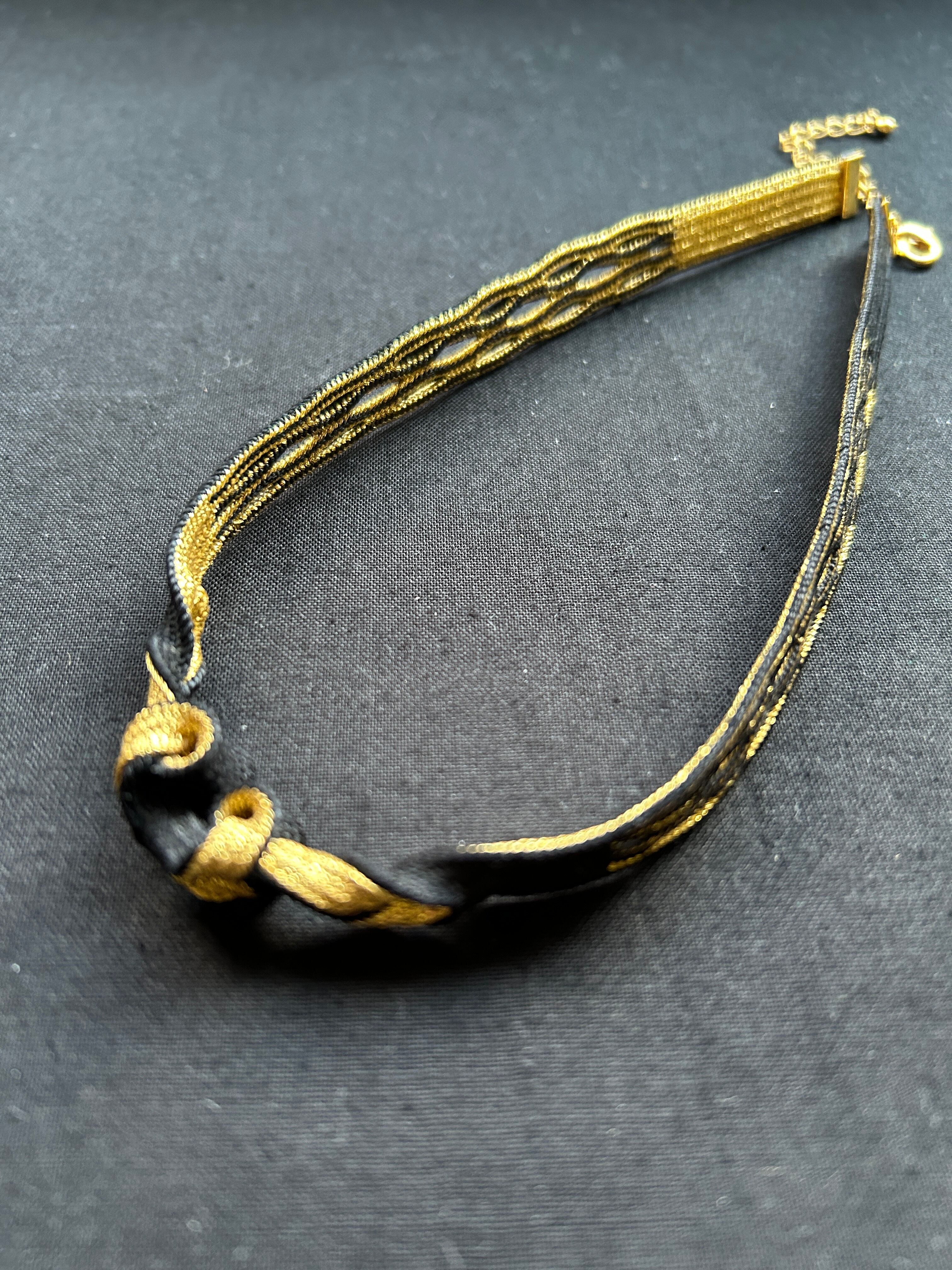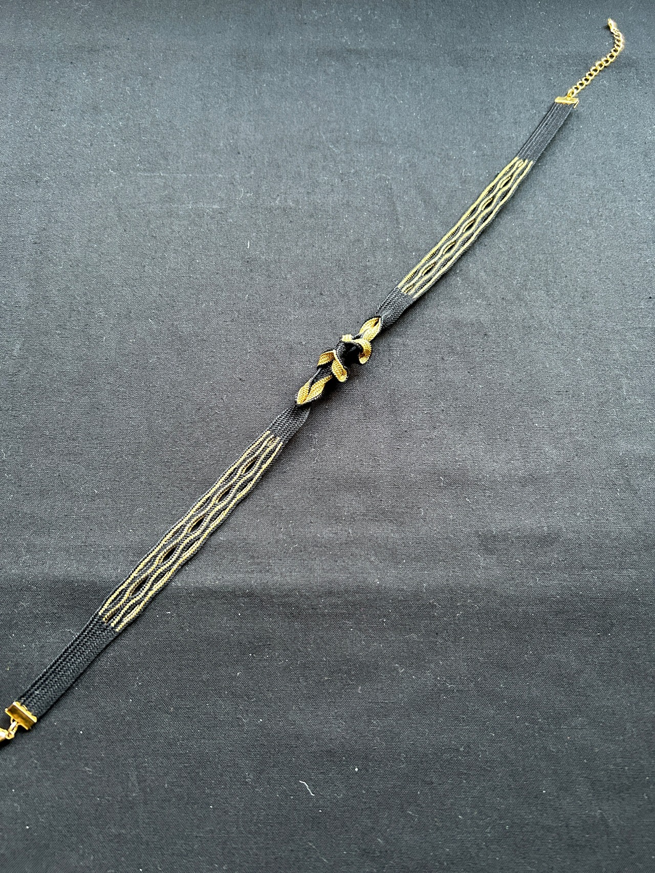 中央のモチーフは、黒と金が交互に絡むように組み上げられ、