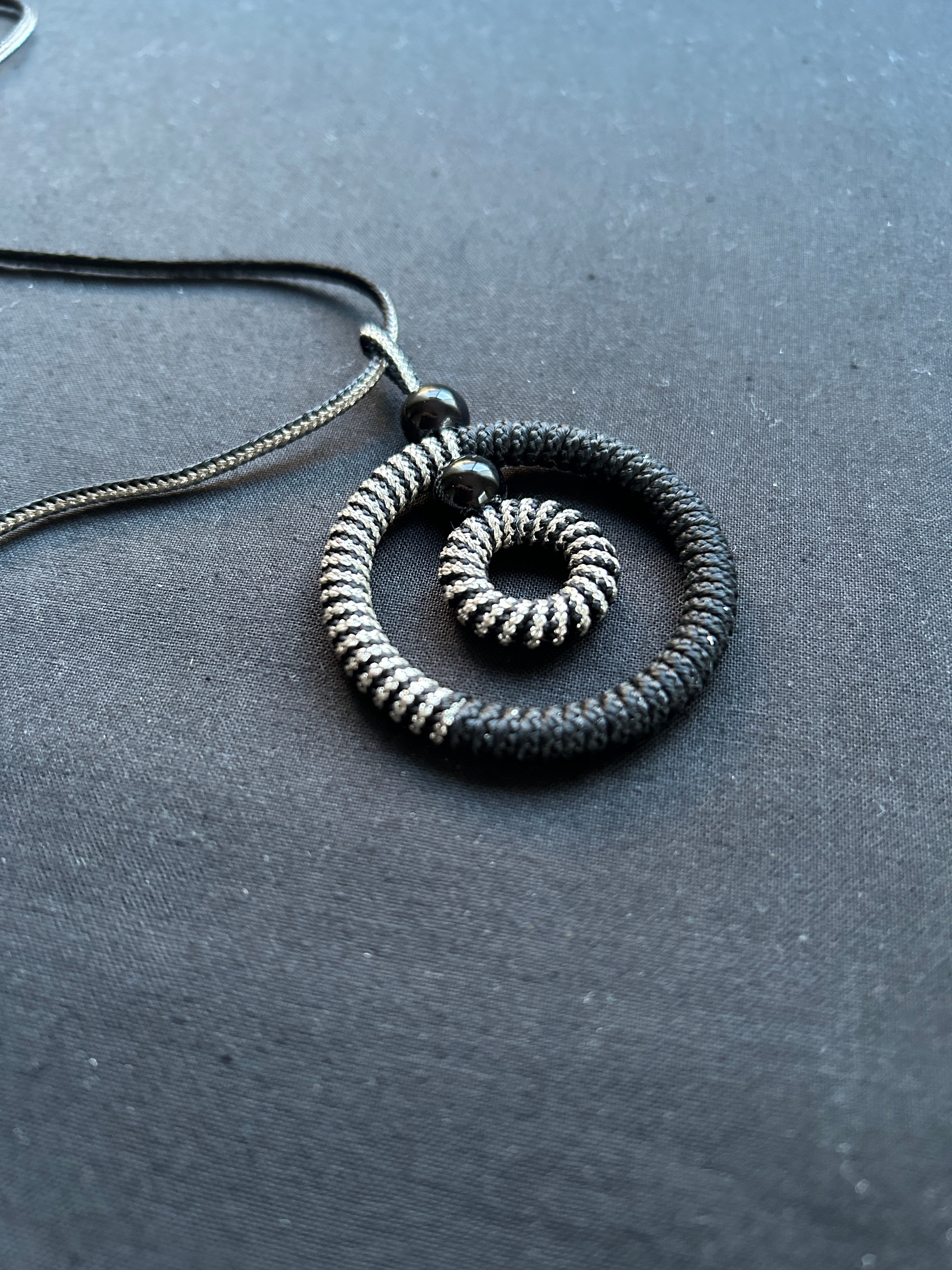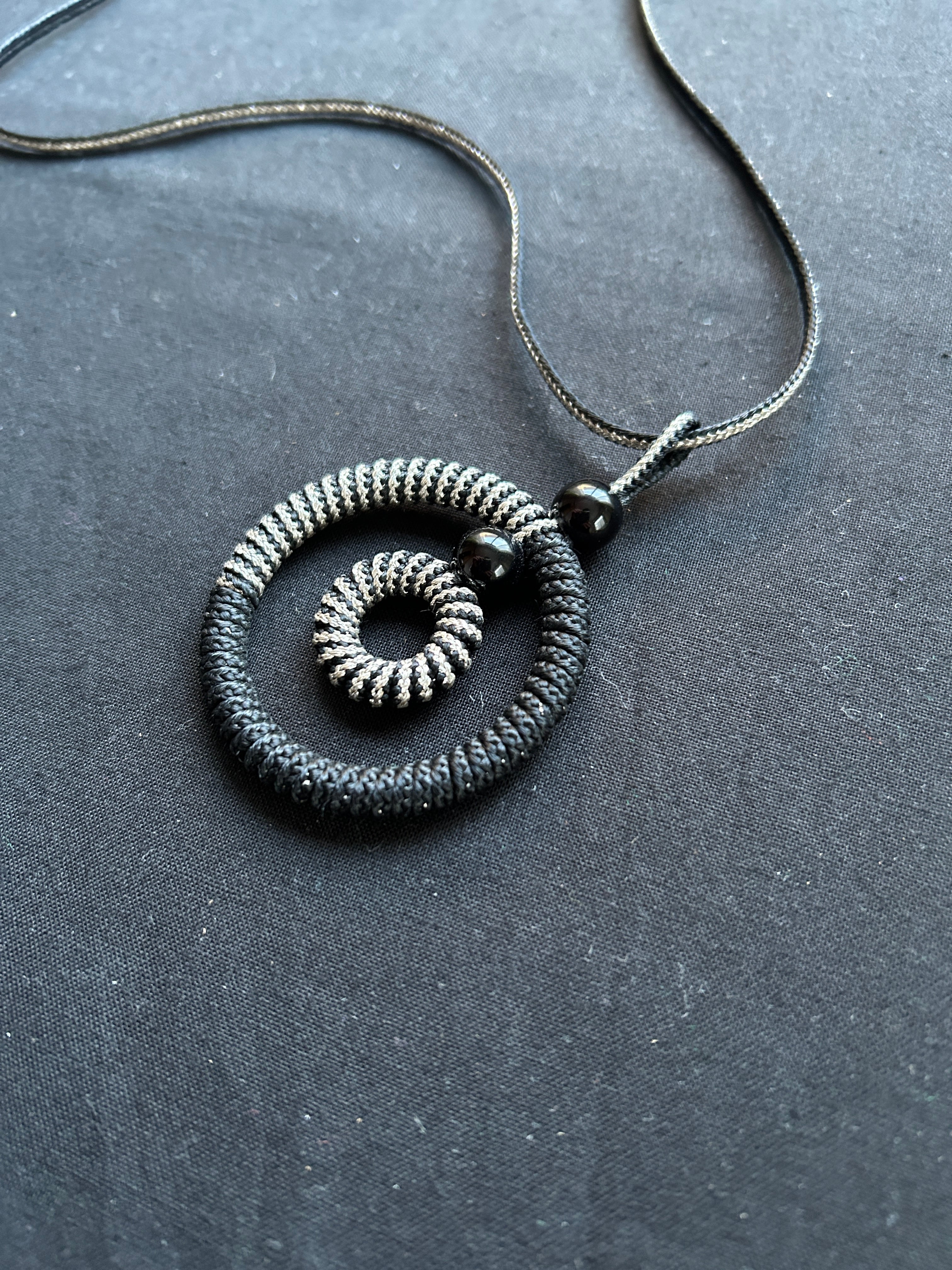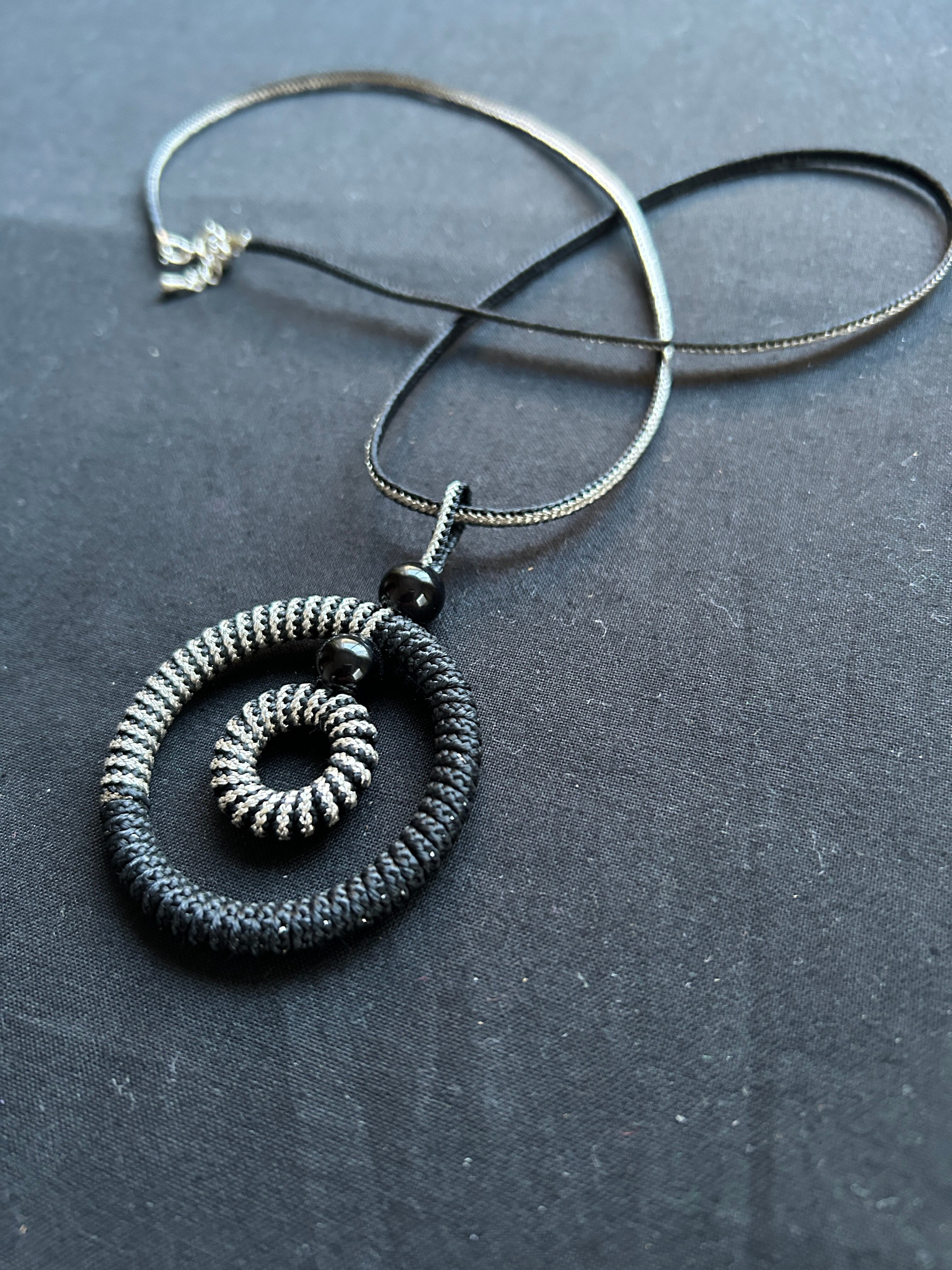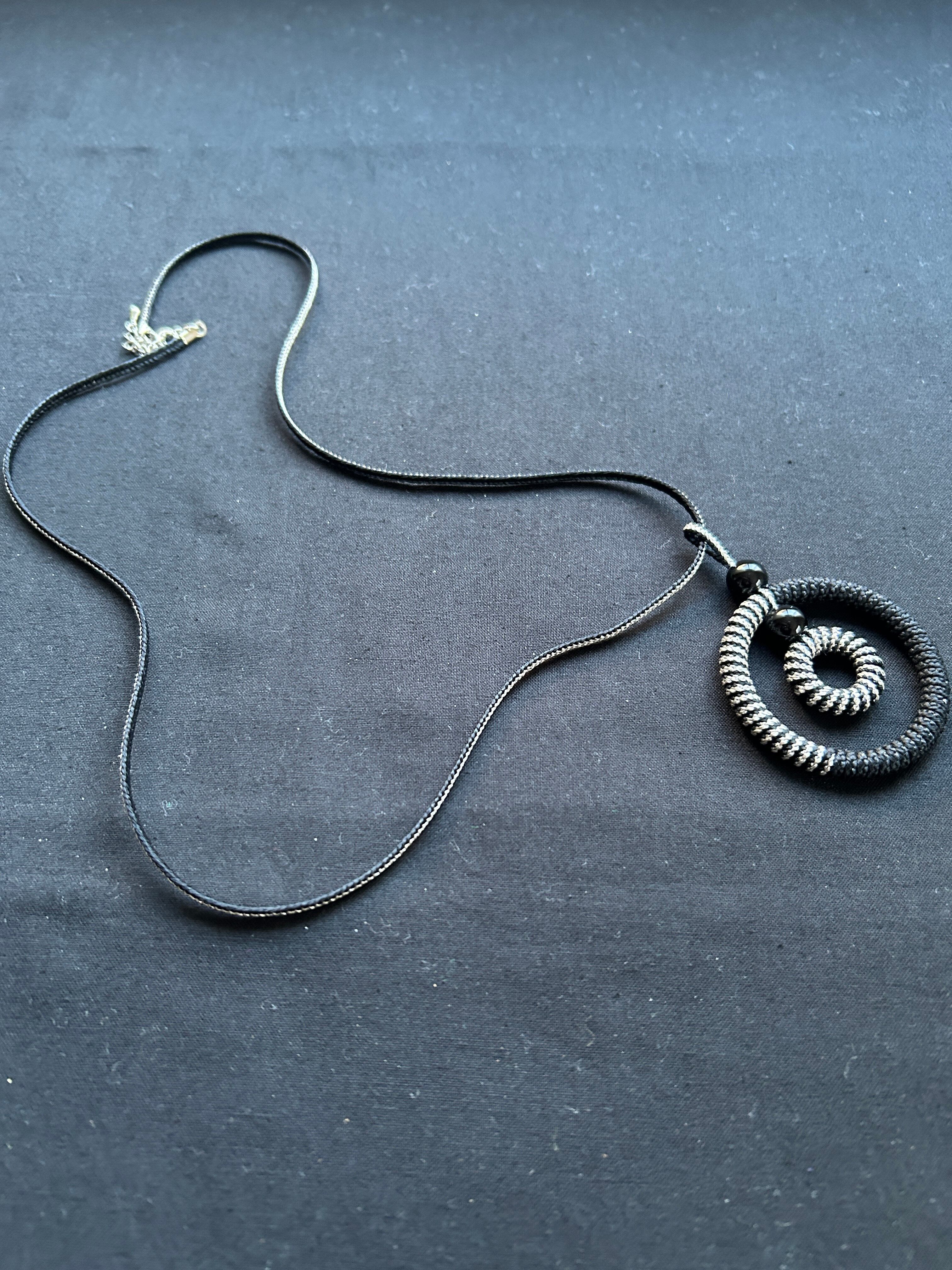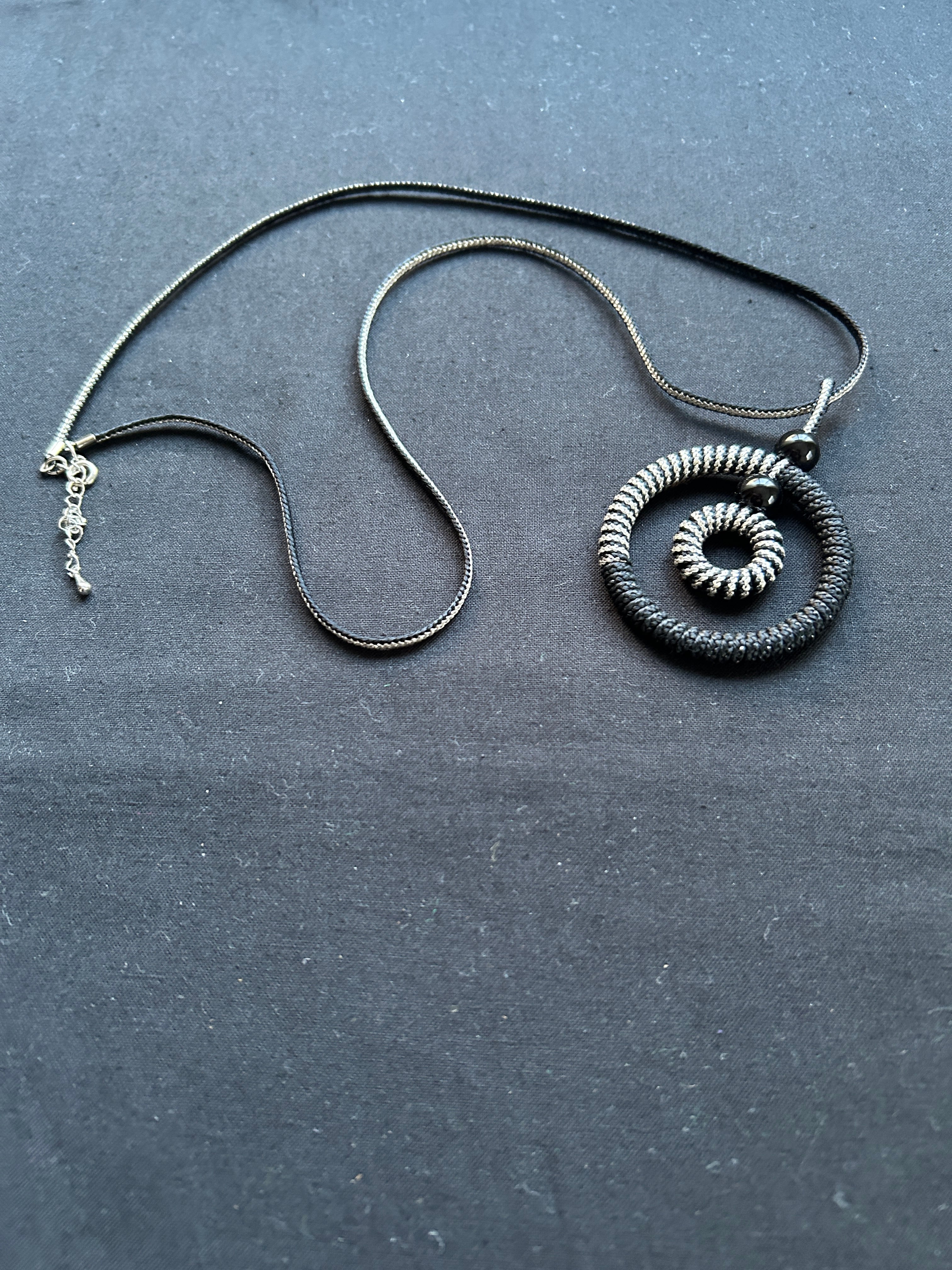 二重に重なる“輪”をモチーフに仕立てた、存在感あるネックレスです。