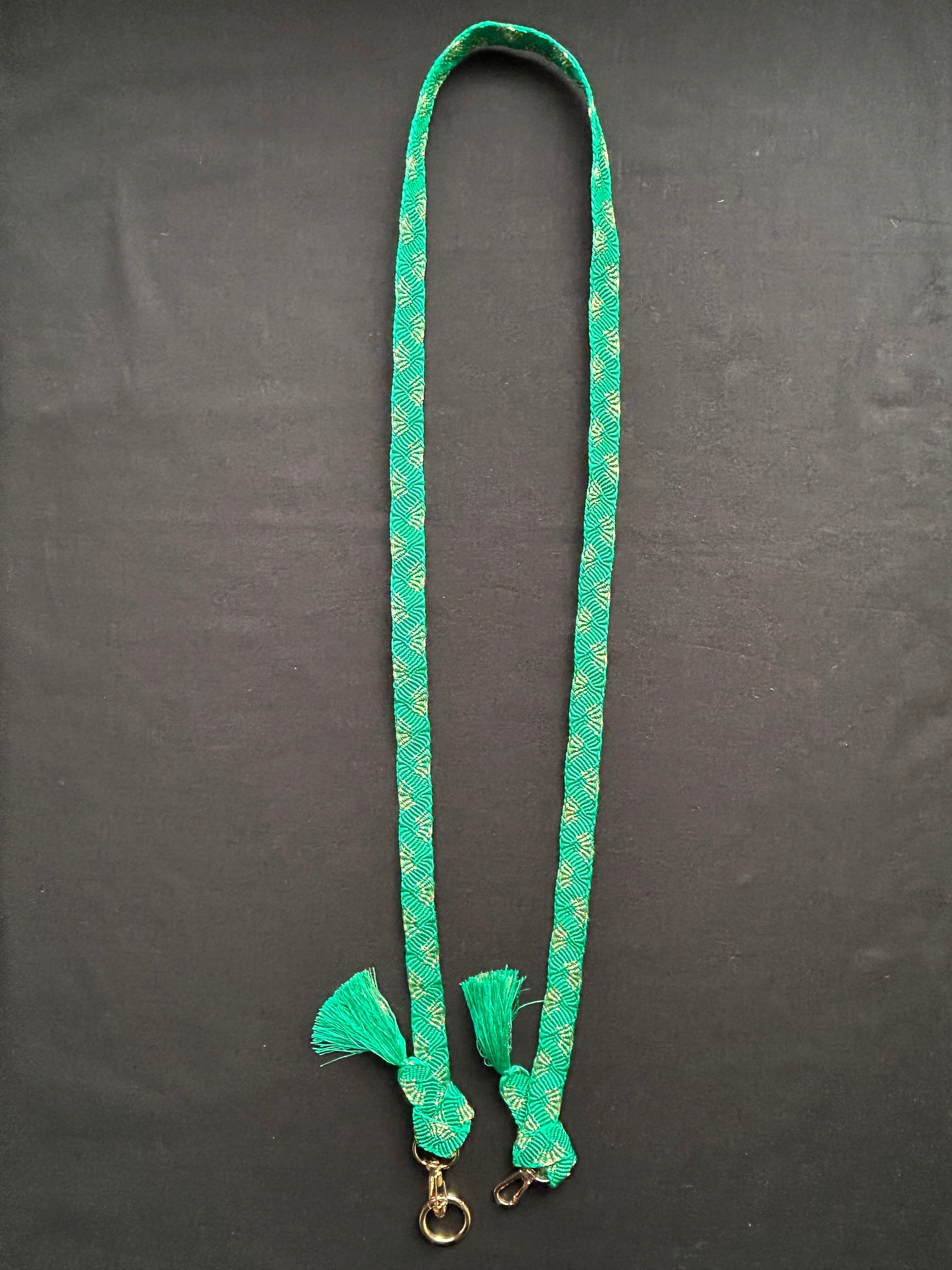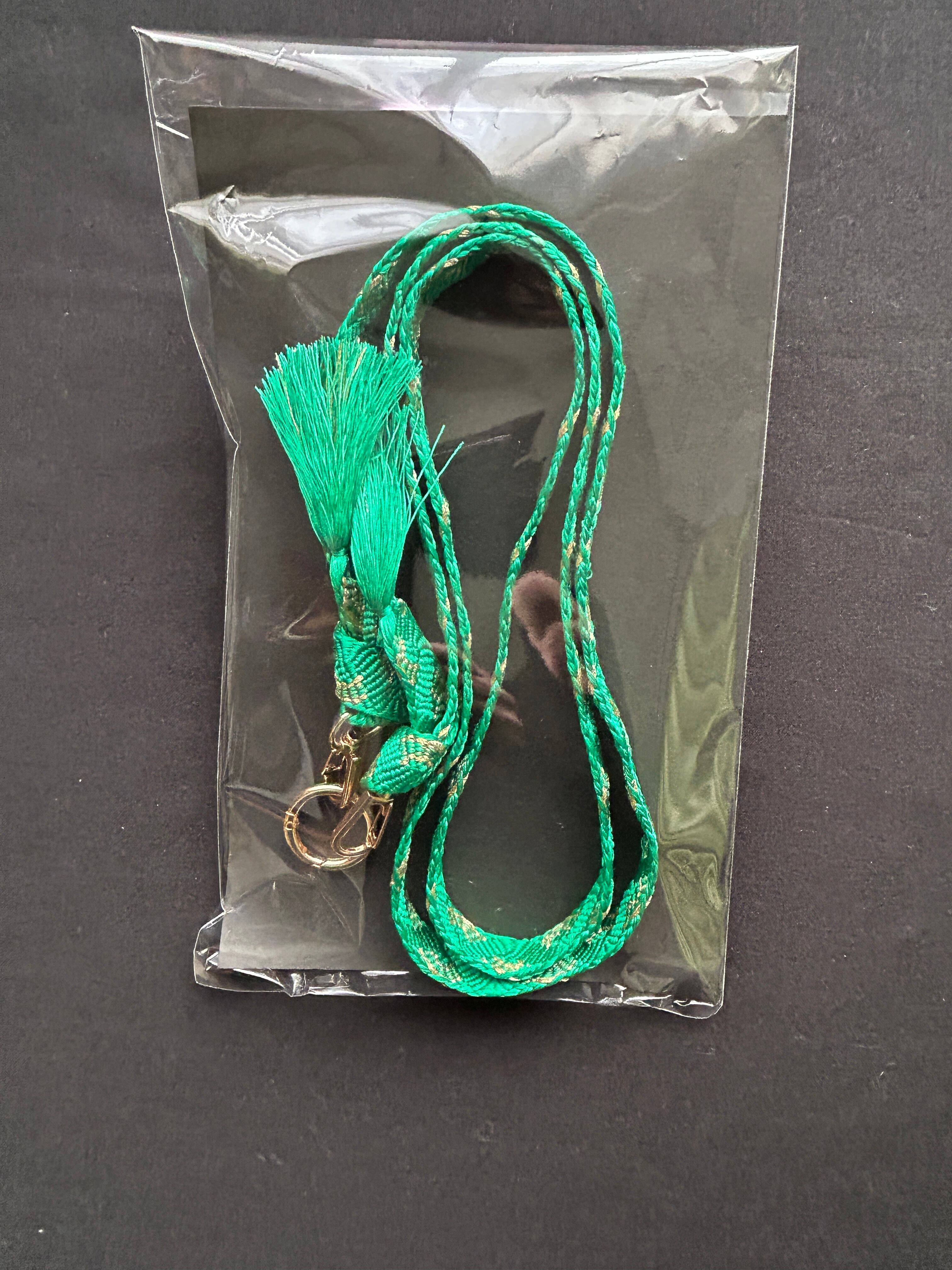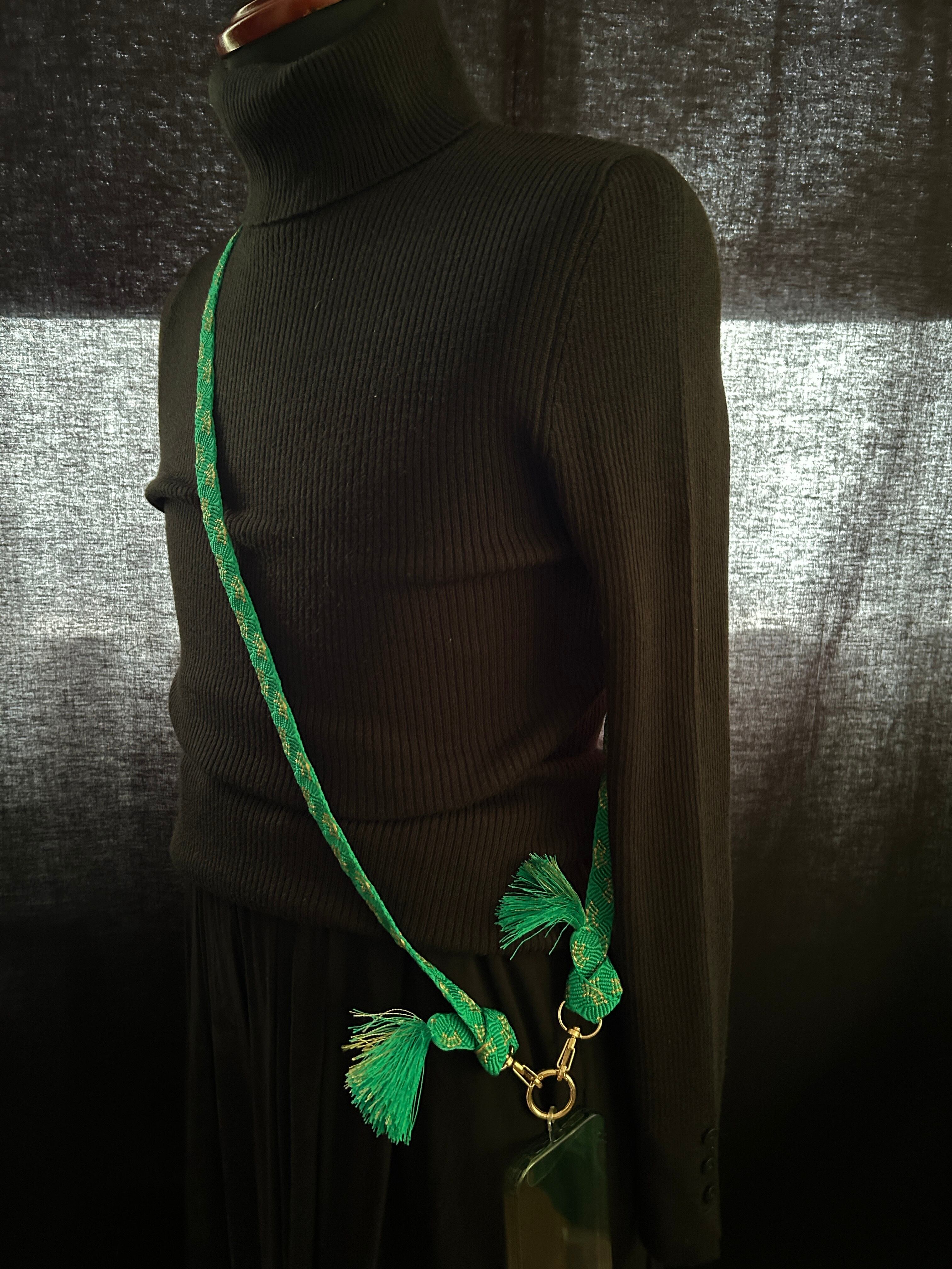 和の文様が織り込まれた緑に、金糸がさりげなくきらめく組紐。