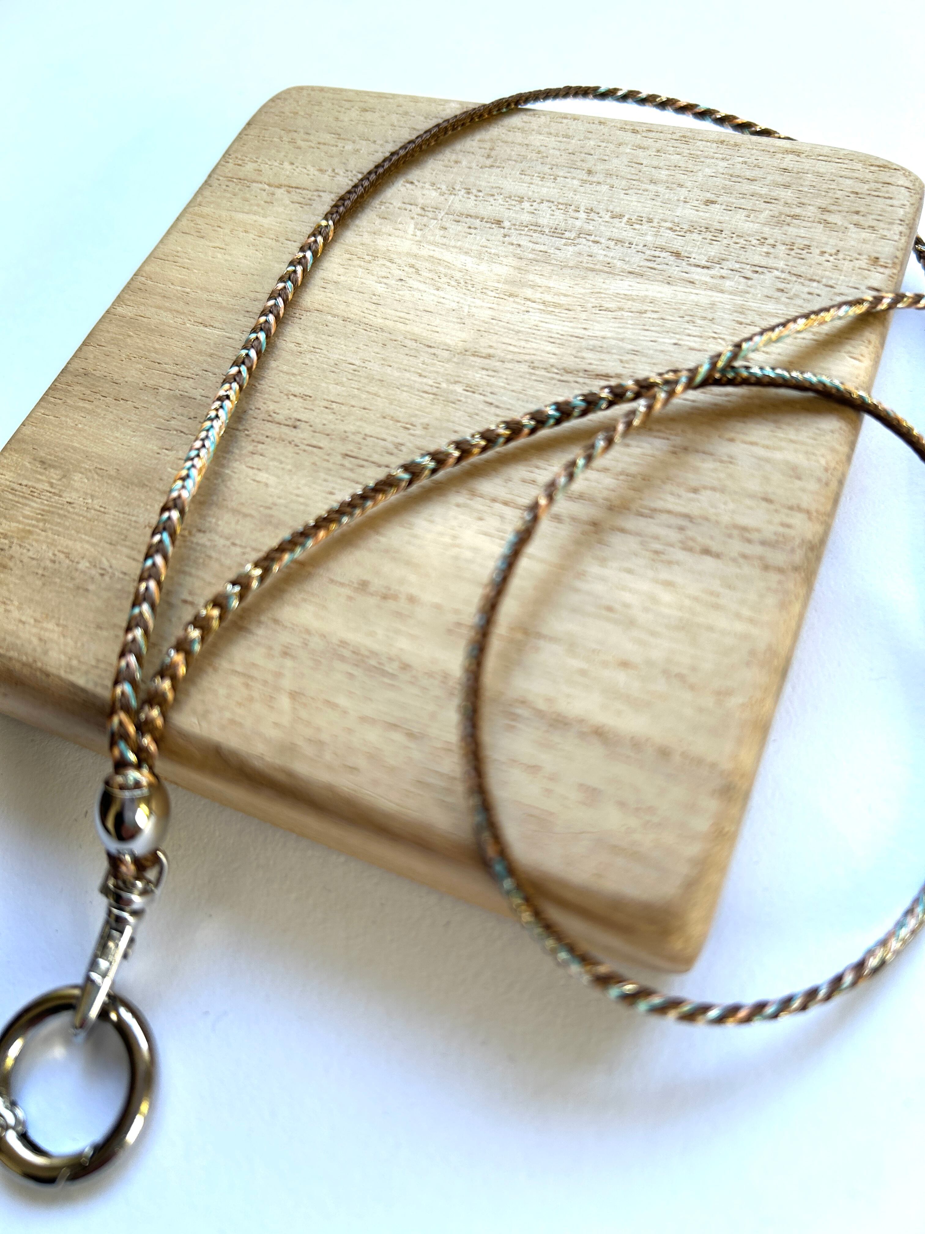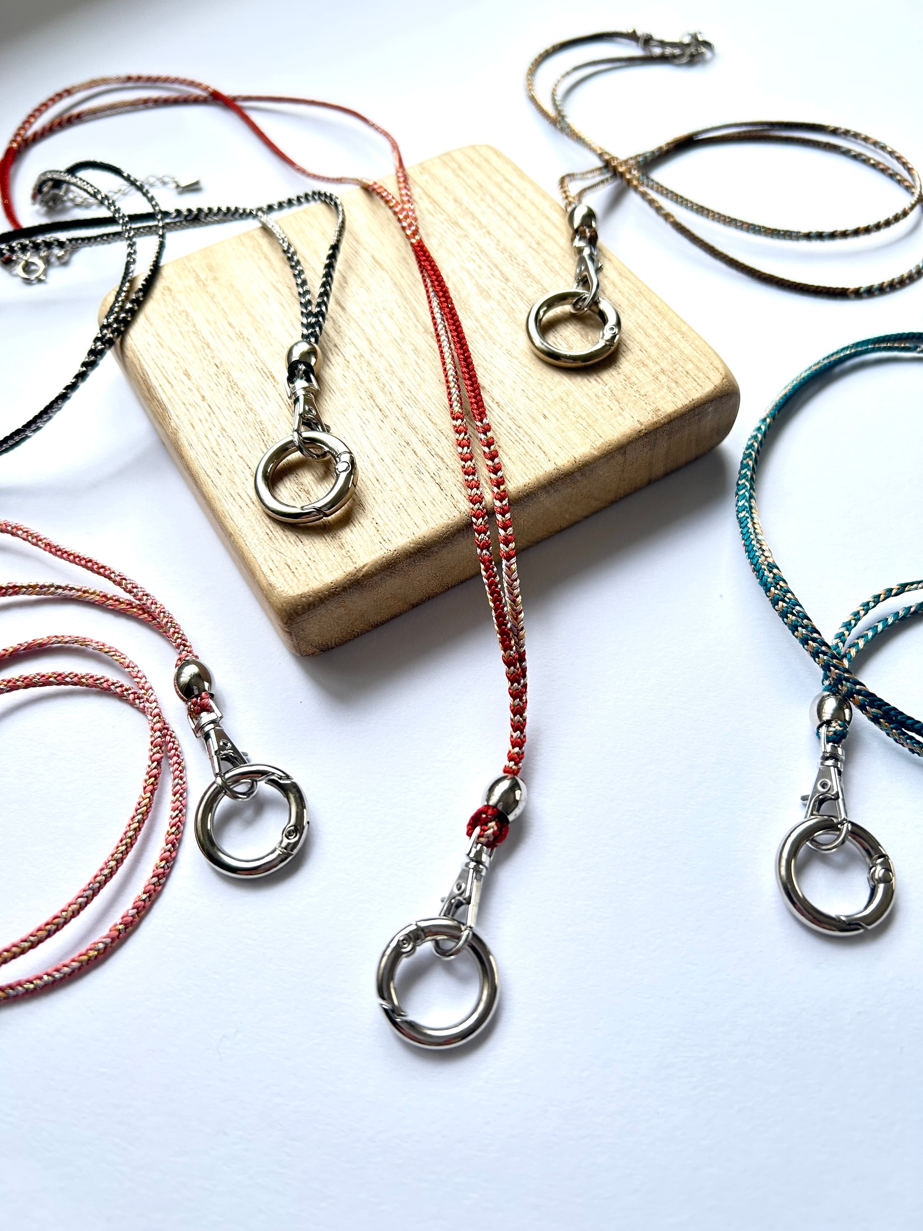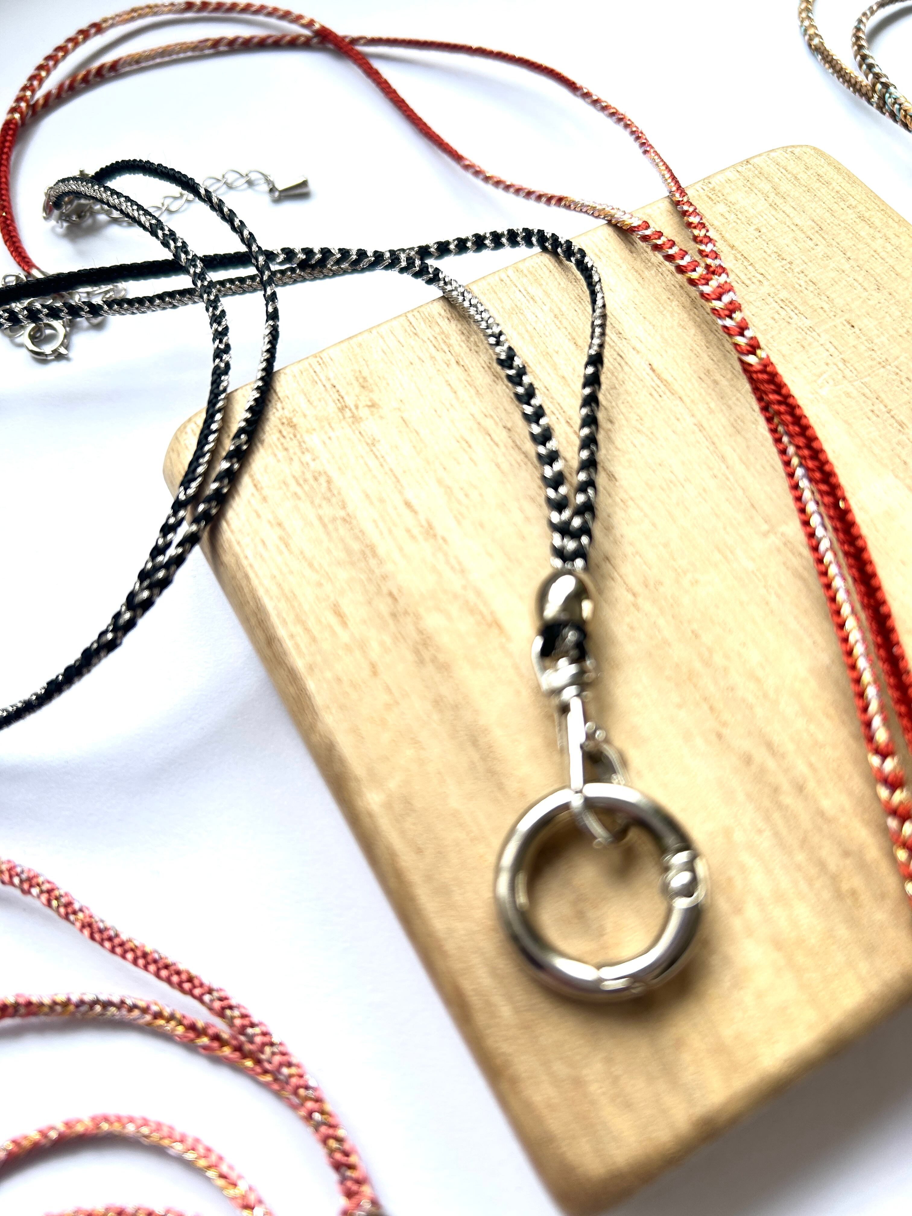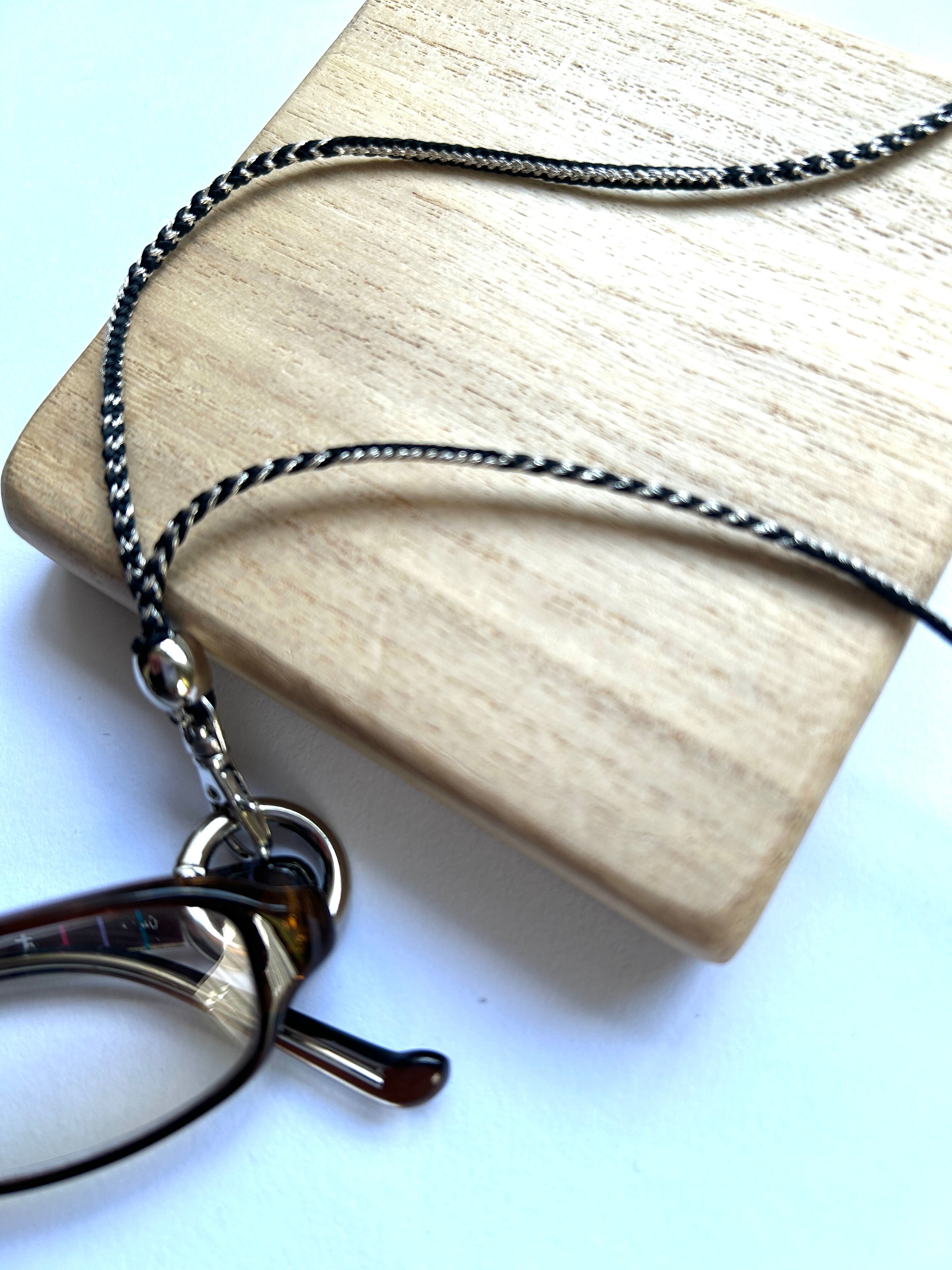 金糸が点々と織り込まれた組紐を使ったサングラスホルダーです。シルバーの留め具を合わせ、一点ずつ仕立てました。